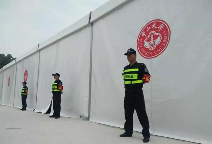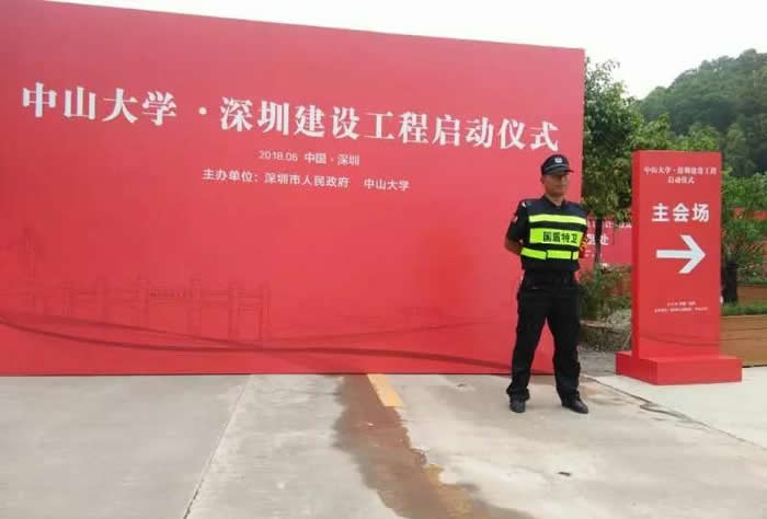 位于深圳市光明新区的中山大学深圳校区建设工程项目启动仪式于6月12日16点30举行,98彩网特卫保安集团经过建设单位严格考核评估,成为中山大学深圳校区建设工程项目安保服务提供单位,专业的安保管理人员及保安人员提前一天进驻启动仪式及施工现场,实施安全保卫管理和人群控制等安保工作,确保了中山大学深圳校区建设工程项目启动仪式安全、有序、正常地进行。
