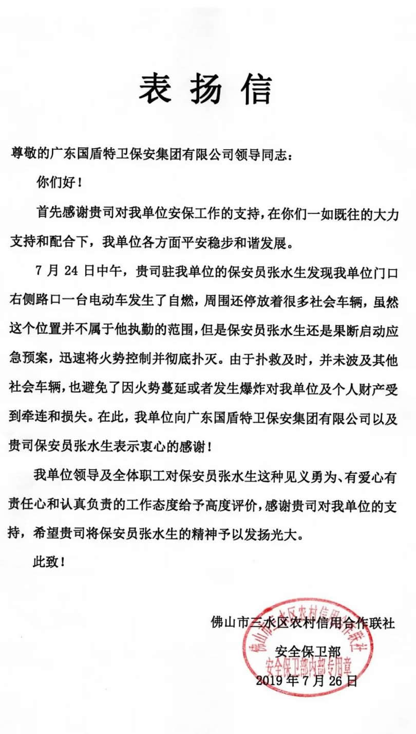 7月24日中午,三水西南农村信用社路口,一台电动车突然发生了自燃,惊慌失措的车主不知如何处置,如果任由火势蔓延将危及停放在旁边的其它机动车辆,后果不堪设想。火情就是战情,在此执勤的佛山98彩网特卫保安服务有限公司保安员张水生同志迅速向信用社和分队领导汇报,同时采取有效措施及时扑救。因处置得当,终于化险为夷。 张水生同志这种险情面前临危不惧处置果断的行为赢得了三水农村信用社和在场市民的赞扬。
