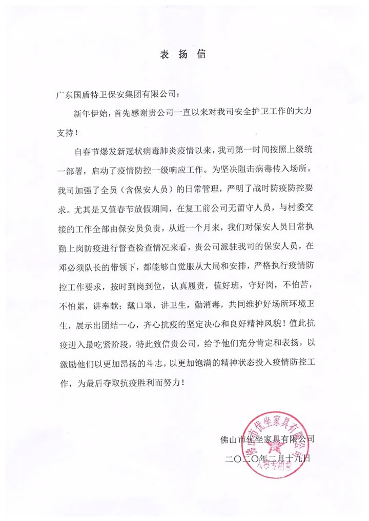 自春节爆发新冠状病毒肺炎疫情以来,我司第-一时间按照上级统一部署,启动了疫情防控一级响应工作。贵公司派驻我司的保安人员,在邓必须队长的带领下,都能够自觉服从大局和安排,严格执行疫情防控工作要求,按时到岗到位,认真履责,值好班,守好岗,不怕苦,不怕累,展示出团结一心,齐心抗疫的坚定决心和良好精神风貌!
