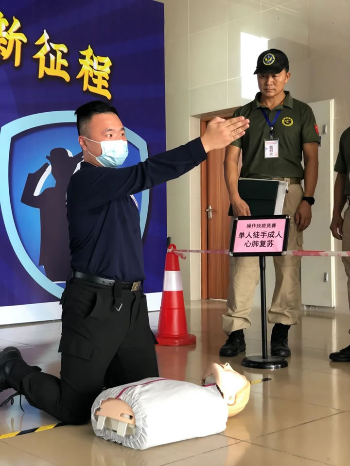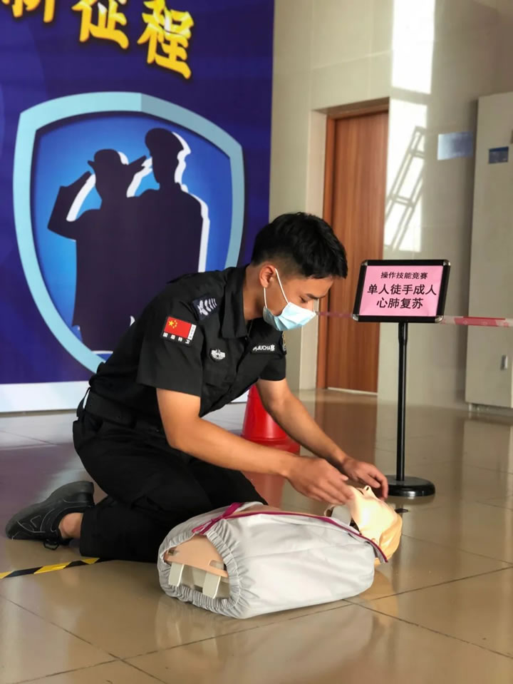 该竞赛分为理论知识考核和实操技能考核两部分。其中,实操技能考核,包括队列基本动作、现场救护技能(单人徒手成人心肺复苏)、消防技能(灭火器使用)三项。
