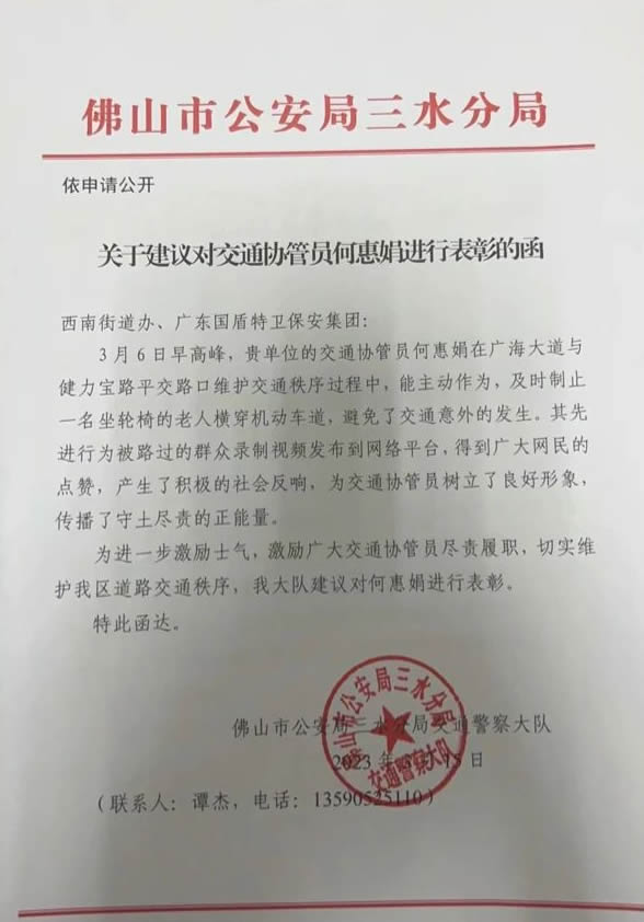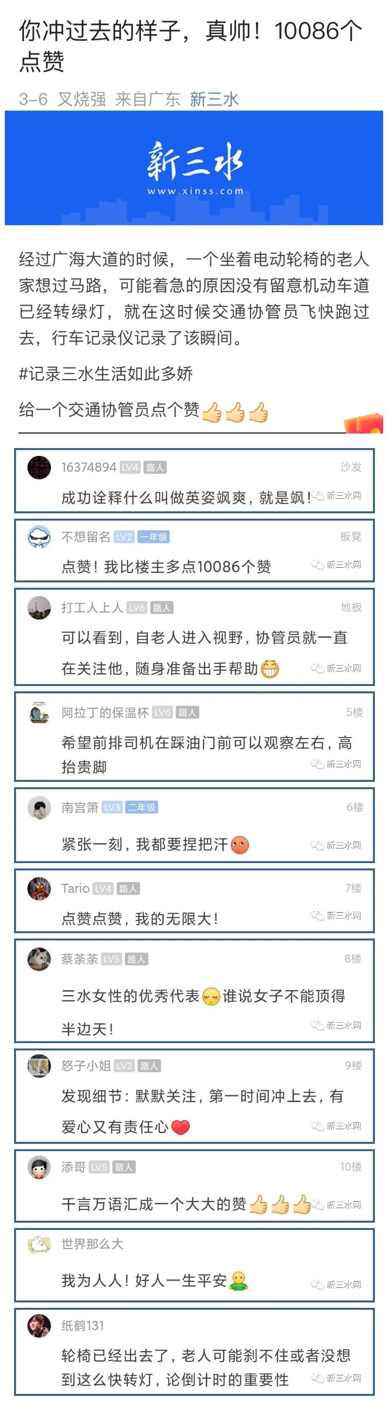 3月6日早高峰时段,在三水城区广海大道与健力宝平交路口,发生惊险一幕:一名坐着电动轮椅的老人正准备过马路,却丝毫没有留意对面的绿灯已转红灯,缓缓地向着不断有车辆驶过的人行道行进……关键时刻,我司派驻的一名交通协管员一个箭步冲上去,快速扶上并刹住了老人家的电动轮椅,及时化险为夷。这一幕被路人的行车记录仪记录下来,并以《你冲过去的样子真帅!10086个点赞》为题在网上发表了帖子,产生了积极的社会反响,获广大网友跟帖点赞!