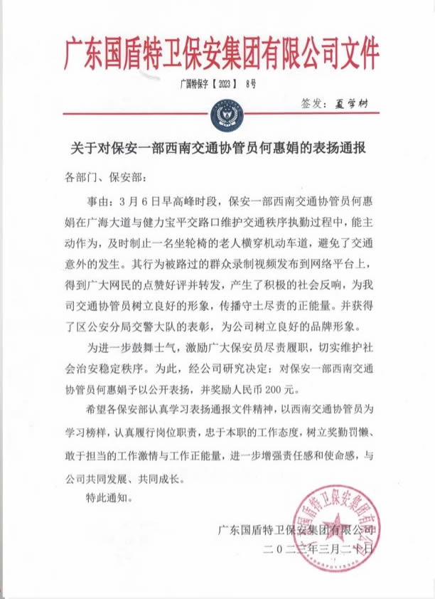 我司协管员何惠娟为西南交通协管员树立了良好形象,传播了守土尽责的正能量,并获得了区公安分局交通警察大队致函表彰。集团公司党支部书记、董事长夏学树获悉后,高度赞扬了西南交通协管员在维护道路交通秩序中尽责履职,能急群众之所急,解群众之所忧,全力为群众排忧解难,用实际行动践行了党的群众路线,认真贯彻落实“我为群众办实事”的举措,同时要求总经办将其事迹形成表彰通报至集团公司各工作群,并指示集团公司党支部副书记、工会主席、董事长助理郑红战连同总经办到西南交通协管驻点办公室送去表彰奖励,号召全体员工以此作为学习榜样,树立“真诚、文明、安全、发展”的服务理念,进一步增强保安从业人员的职业认同感、自豪感。